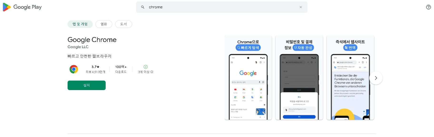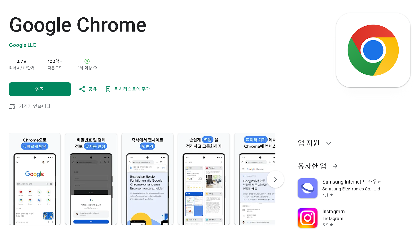 모바일 버전 크롬은 PC버전에 비해 설치가 간단합니다. 안드로이드 기기 사용자는 구글 플레이스토어에서 크롬을 다운로드할 수 있습니다.