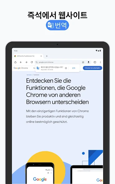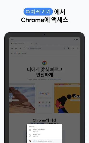 "Chrome은 빠르고 안전하면서 사용하기 쉬운 웹브라우저입니다. Android용 Chrome은 맞춤 뉴스 기사, 즐겨 찾는 사이트로 빠르게 이동하는 링크, 다운로드 항목을 제공하며, Google 검색과 Google 번역이 내장되어 있습니다. 지금 다운로드하여 친숙한 Chrome 웹브라우저 환경을 사용 중인 모든 기기에서 즐겨 보세요.