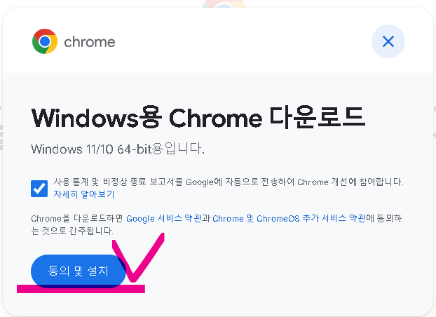 윈도우용 크롬 다운로드 화면이 나오면 '약관 동의 및 설치'를 클릭합니다. 크롬 개선 참여 옵션은 선택하지 않아도 다운로드에 영향을 미치지 않습니다.